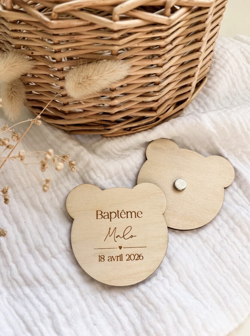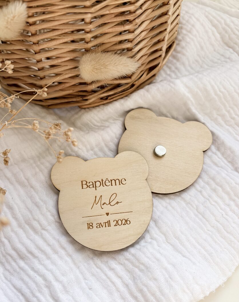 Offrez à vos invités un souvenir tendre et intemporel avec ce magnet ourson en bois personnalisé, spécialement conçu pour célébrer un baptême tout en douceur 🤍