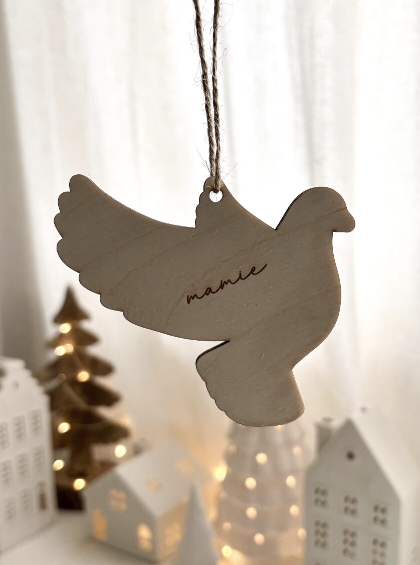 Boule de Noël colombe personnalisée – Une jolie colombe symbolisant la paix et le souvenir. Personnalisez-la avec le prénom de votre être cher disparu pour lui rendre hommage et garder sa présence au cœur de votre sapin.